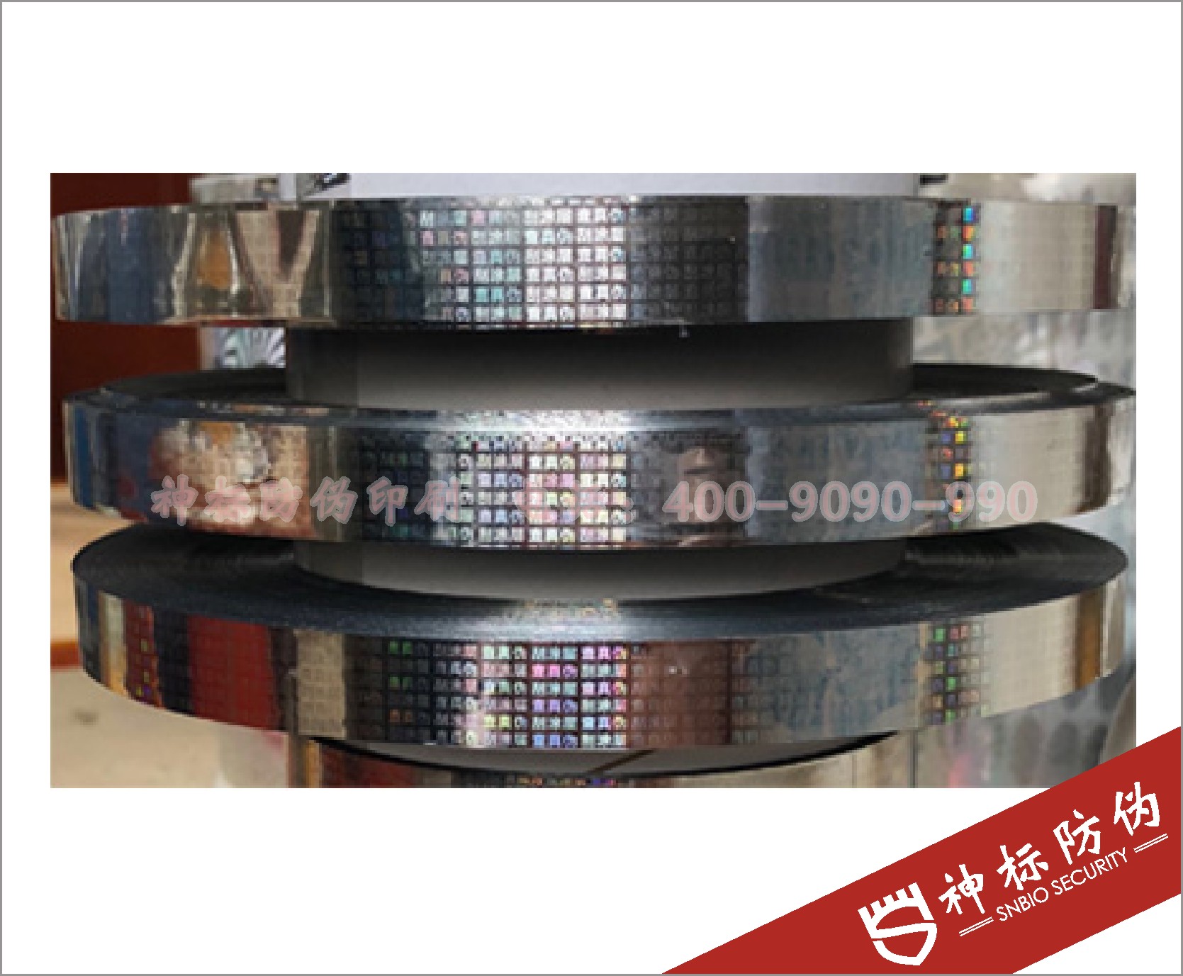 电化铝箔是一种在薄膜片基上经涂料和真空蒸镀复加一层金属箔而制成的烫印材料。厚度一般有(12、16、18、20)um。500~1500mm宽的聚脂薄膜,国内一般有16um厚,500mm宽的薄膜。在薄膜片上涂布脱离层、成像层、模压镭射图案,经真空镀铝再涂布胶层,最后通过成品复卷而制成的。国产电化铝箔一般为4~5层。
